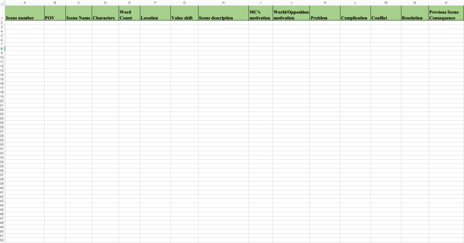 But if you’re unsure if spreadsheeting will work for you or if you’ve never tried it or if you’re afraid of it, I suggest you take the plunge and spreadsheet your story! I included my basic template that you can edit and move around or just use as a way to make your own spreadsheet.