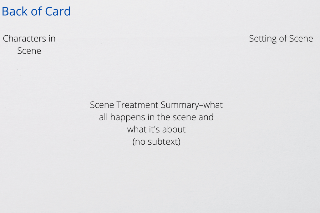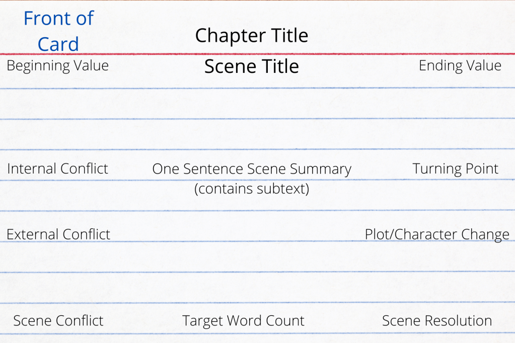 My template for what information to use on the card is below. And for reference, I use the larger 4-inch by 6-inch lined index cards because they’re just big enough for all the information I need to include but not big enough where I start packing my scenes with too much.