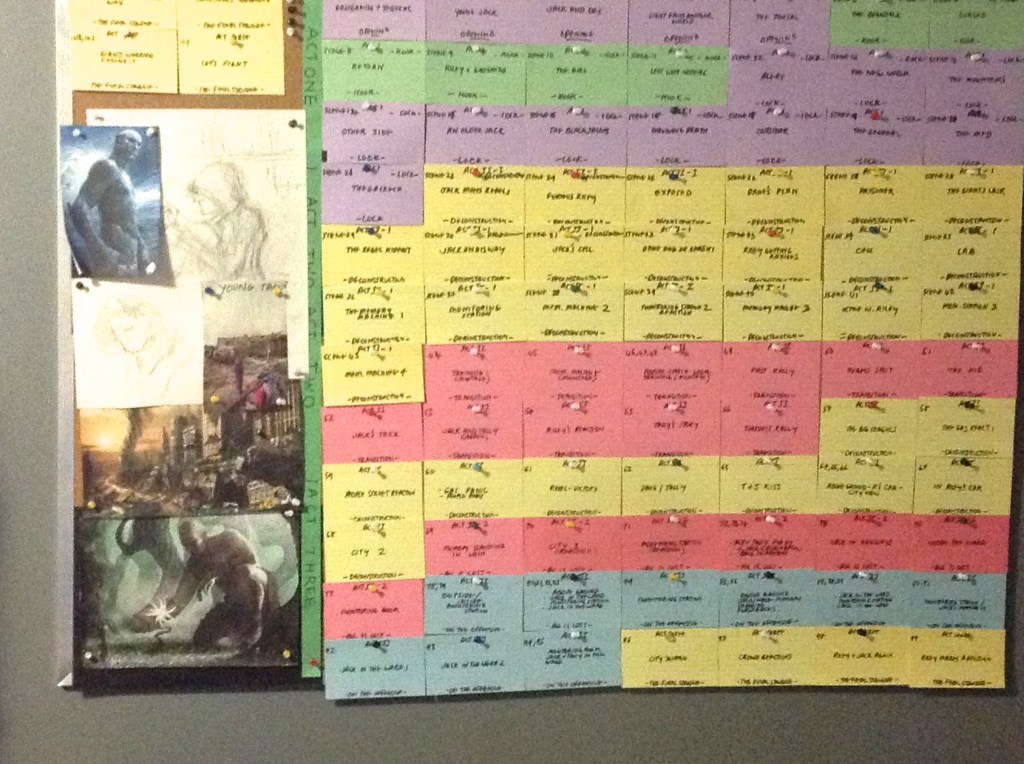 On index cards sometimes just on a dry erase board or poster board, writers build a story just by its scenes. Instead of writing it out word by word, they draw or sketch it with images or words. Sometimes it’ll just be something as simple as ‘The Bad Man Dies’ and some sketch of how the scene should look or take place.