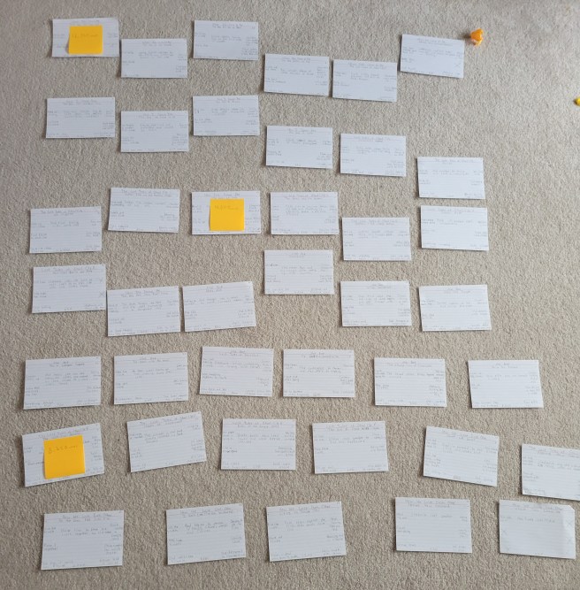 I’ve written a bit before about my scene card technique and its benefits, so I won’t go on to much about that side of scene carding. Instead, I’ll focus on this current round of scene carding and what I’ve learned from breaking my horror novella out into its moving parts.