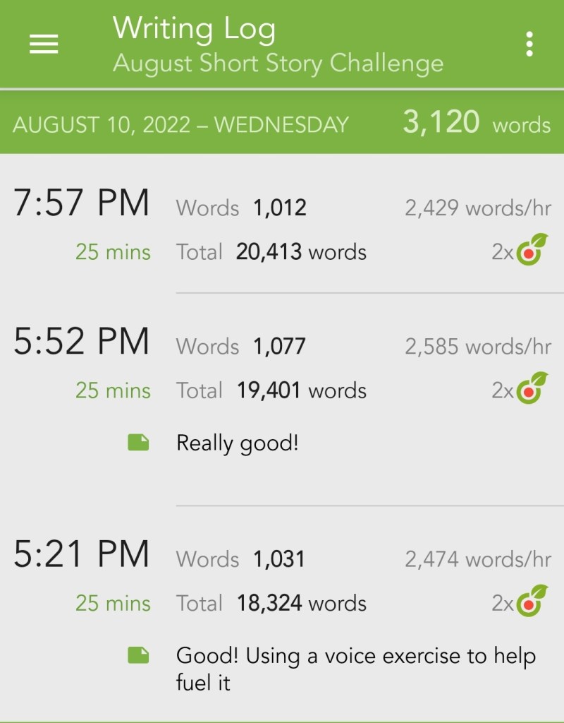 All that work ended up paying off, and I can see it in my writing stats for this short story challenge. I think another part of what’s helping me this go-around is the character voice cards I created. For the past few months, I’ve been studying voice. It’s mostly been me doing exercises and reading books, but I wanted to do some more deliberate practice. So I wrote out 31 voice cards detailing character attributes that help craft a character’s voice, like their age, location, inner desires, and social status. The voice cards give me a great jumping-off point to start my story.
