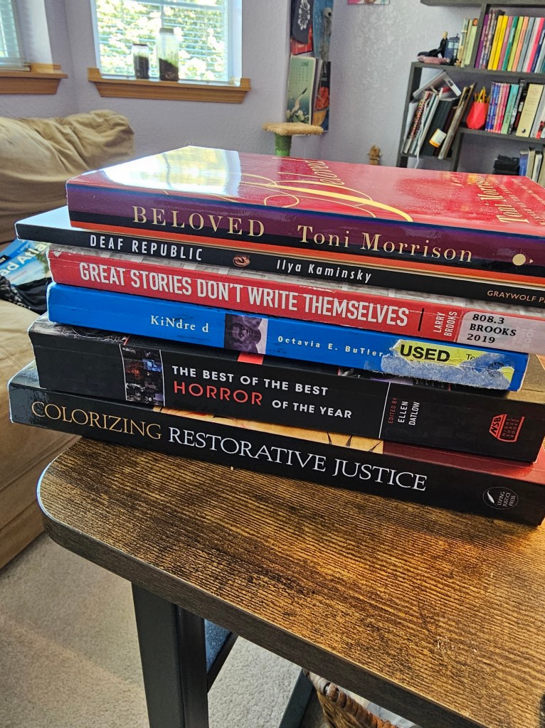 Even though I am studying fiction, the books that have helped shape my craft over the past year have all been largely nonfiction books. I love a good novel but the way Colorizing Restorative Justice gave me useful tools and ideas to try out in my work and ways of thinking about my work and how I use language, resolution, and conflict to perpetuate harm in certain ways and how to do it differently has been more impactful than books I’ve read that show these elements. Meander Spiral Explode sparked my new love of trying to create narrative forms based on patterns I see in nature and around me that intrigue or capture me (whether positively or negatively). Because of Meander Spiral Explode I started designing a new narrative form that has been challenging and exciting to explore and play in.