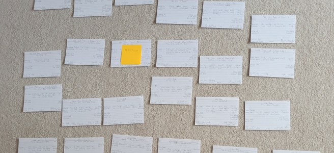 On index cards sometimes just on a dry erase board or poster board, writers build a story just by its scenes. Instead of writing it out word by word, they draw or sketch it with images or words. Sometimes it'll just be something as simple as 'The Bad Man Dies' and some sketch of how the scene should look or take place.